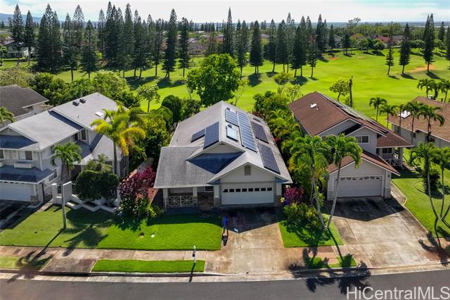 Welcome to your tropical oasis situated on the fifteen hole of the Waikele Golf Course in the coveted Highland View Estates! Nature's bounty is on full display with an enchanting edible landscape with rare fruit trees including Cacao tree, black peppercorn vine, tangerine tree, local avocado, dragon fruit, lime tree, and indulge in the rich aroma and delicate charm of the puakenikeni tree and paklan tree. This renovated and stunning single level , energy efficient home boasts 38 OWNED photovoltaic panels on net metering with additional battery storage, solar water, solar attic fans, an electrical vehicle charger, and a security system! Stay cool inside with split A'C's in every room, or go outside and enjoy your panoramic fairway views with nature inspired elegance. Come and embrace a lifestyle where every day feels like a getaway- right in the heart of Waikele. Schedule your private showing today!
