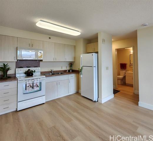 Turn-key, priced right & ready now!! This rarely available 6th-floor unit has plenty of upgrades and is move-in ready. Fully refreshed, this 444 sq ft layout boasts new laminate flooring, new ceiling fans, new refrigerator, new in-sink disposal, and has been professionally deep-cleaned. Bright and breezy with mountain views. Secured with building manager, 24/7 security patrol, elevators, BBQ area, indoor recreation area, dog park, community garden, and multiple guest parking stalls. One assigned open parking stall with gated FOB access. Low maintenance fees include water/sewer & 100% hurricane insurance. Pet-friendly (verify rules), VA-approved, fee simple. Prime Lower Waipahu location – walk to Waipahu District Park, close to Costco, Waikele Outlets, new Skyline rail & H-1. Minutes to Ted Makalena Golf Course and military bases Wheeler Army Airfield & Joint Base Pearl Harbor-Hickam.