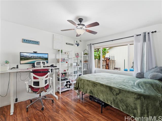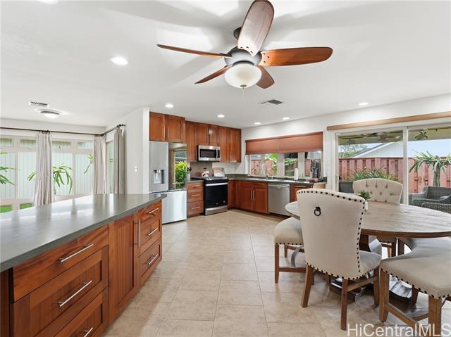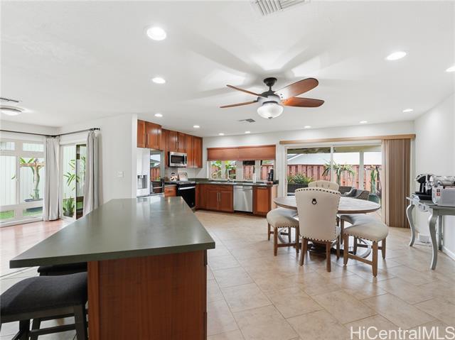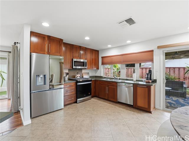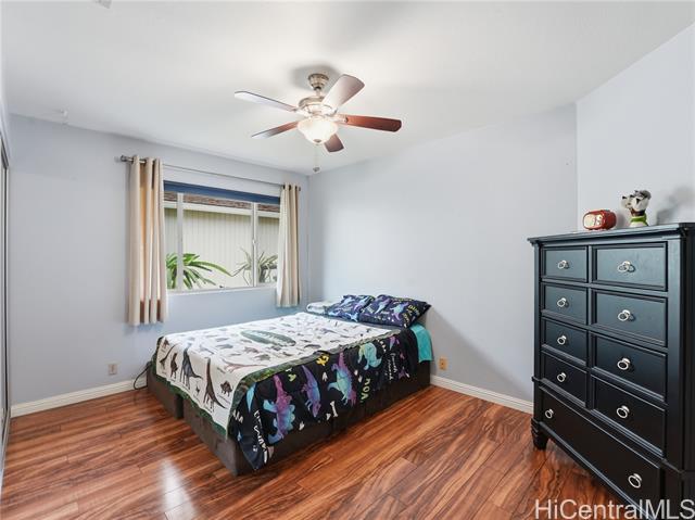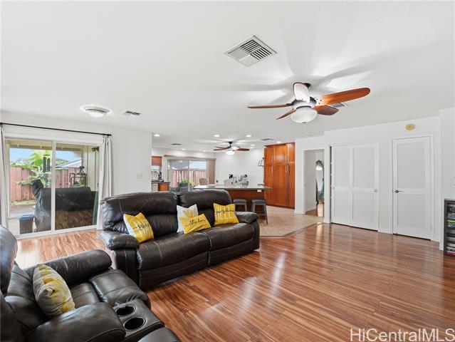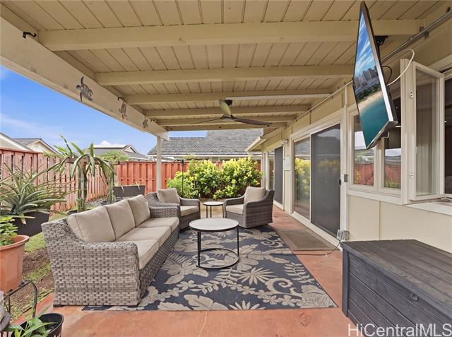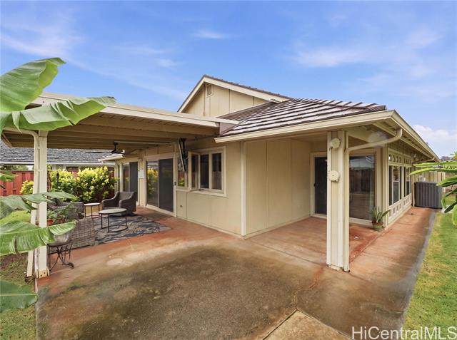 Well-maintained, owner-occupied & move-in ready, this single-level home sits on a rare 5,002 sq. ft. lot & has been genuinely cared for inside and out. Bright & open, the wide floor plan is filled with natural light from large windows throughout. Central A/C keeps things comfortable year-round & the energy setup is hard to beat: 24 owned photovoltaic panels on Net Metering! plus 2 newTesla batteries that have already proven their worth during recent storms. The metal shake roof means no insurance headaches & the gas oven and stove are a bonus for anyone who actually likes to cook. ADA shower rails are already in place for added accessibility & peace of mind. Step outside and you have real usable space: a large covered patio that flows naturally from the interior, a fully fenced yard with room for dogs to roam, & dedicated space for gardening. Mature fruit trees are already established & producing. The cul-de-sac location backs up to a large greenbelt, giving you added privacy & fewer neighbors around. Minutes from Foodland, Costco, Waikele Outlets, Central Oahu Regional Park, dining & easy freeway access. Hard to find this much space & this many upgrades at this price point!