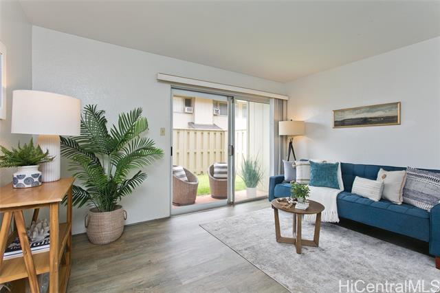 Excellent opportunity to own this charming Rainbow Kauhale Series townhome in desirable Waipio Gentry! Check out this 2bed/1bathroom preferred ground floor corner unit with added privacy and a spacious, fully fenced courtyard — perfect for barbecues or relaxing with the keiki or pets. Thoughtfully upgraded with newer luxury vinyl plank flooring, modern kitchen and bath cabinets, sleek countertops, & smooth surfaced ceilings. Enjoy the convenience of an assigned parking stall, plus plenty of street parking nearby. Pet-friendly complex and a great starter home. Close proximity to Kanoelani Elementary, jogging paths, Costco, restaurants, Central O‘ahu Regional Park, and freeway access. BONUS: ask how the total HOA fees can be LOWERED to only $541.92/mo!