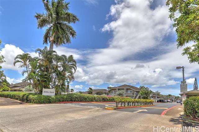 Take advantage of this opportunity to own this studio unit in the desirable Royal Palm at Waipio! This unique townhouse studio unit has been well maintained and includes a lanai with storage closet, stacked washer/dryer and 1 covered parking! This complex is centrally located near shops, park and restaurants!