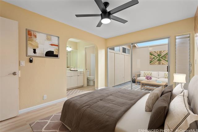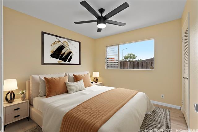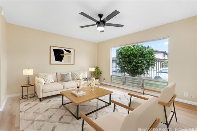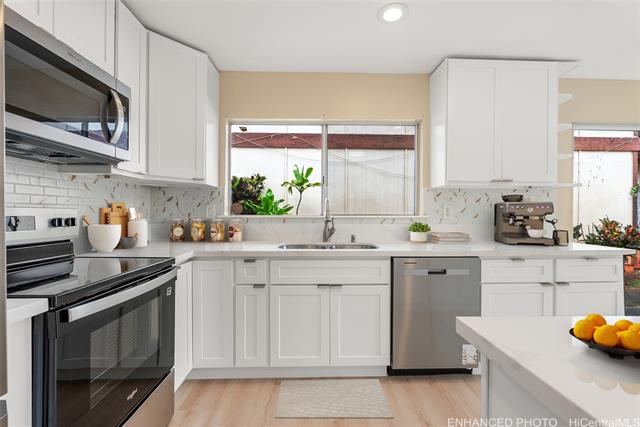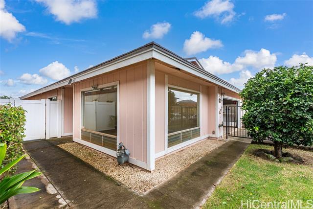 Welcome to this beautifully updated single-level home in desirable Waipio Gentry. Thoughtfully renovated this move-in ready residence offers comfort, style, and convenience in a well-established neighborhood. The newly upgraded kitchen features brand-new cabinets, quartz countertops, and new appliances, complemented by durable luxury vinyl flooring and fresh interior paint throughout. Both the kitchen and bathrooms have been tastefully updated to provide a modern, clean look with easy maintenance in mind. A new metal roof adds additional value and peace of mind. This home has includes a bright sunroom that adds additional living space ideal for relaxing, entertaining, off the primary bedroom. The low-maintenance wrap around yard and a large orange tree complete the outdoor living space. Ideally located on a quiet cul-de-sac with convenient freeway access, this home is nearby Costco, schools, shopping, and Patsy T. Mink Central O‘ahu Regional Park, featuring an Olympic-size pool, sports fields, and walking paths. A wonderful opportunity to own a beautifully updated home in one of Central Oahu’s most convenient locations. Contact your realtor today for a showing!