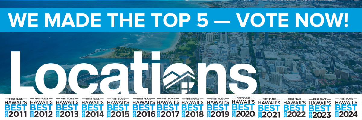 Thanks to the incredible support of our amazing clients and the readers of the Honolulu Star-Advertiser, Locations and our affiliate companies made it into the Top 5 in Hawaii’s Best 2025. Additionally, Locations agent Stephanie Chan is in the running for Hawaii's Best Realtor, and Hawaii Mortgage Group's Jay Miller and Tim Bui are going for Hawaii's Best Loan Officer. We humbly ask that you help us to secure First Place wins again.