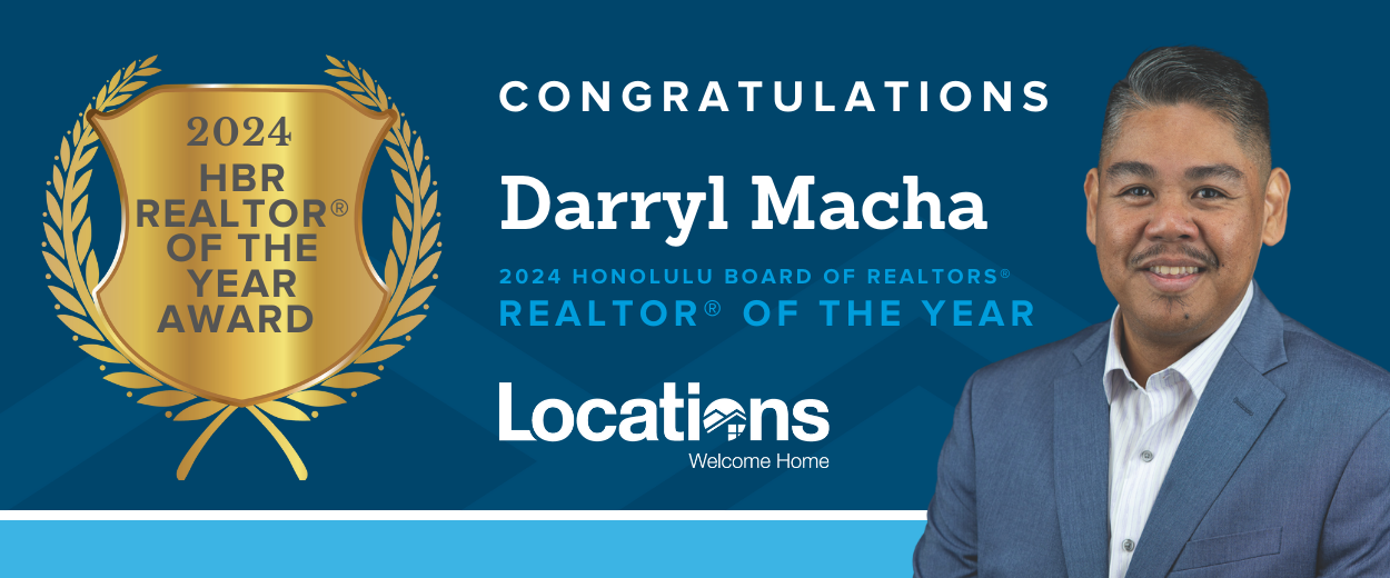 Locations is thrilled to celebrate a remarkable achievement by one of our own—Darryl Macha, Principal Broker, has been named the 2024 Realtor® of the Year by the Honolulu Board of Realtors®. This prestigious honor, awarded annually, recognizes an Oahu Realtor® who exemplifies professional excellence, ethical integrity, community engagement and leadership within local, state, and national Realtor® organizations.