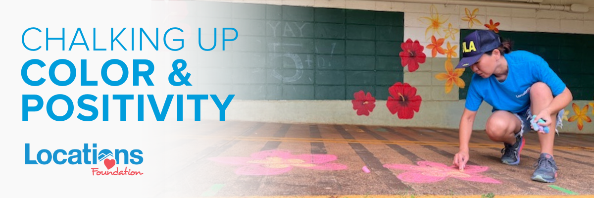 Our artsy Locations Foundation volunteers hit the road once again on a sunny Saturday in May 2024 to add colorful, encouraging messages and drawings in chalk to the walkways of Koko Head Elementary in Hawaii Kai to mark the conclusion of the school's week-long American Heart Association activities.